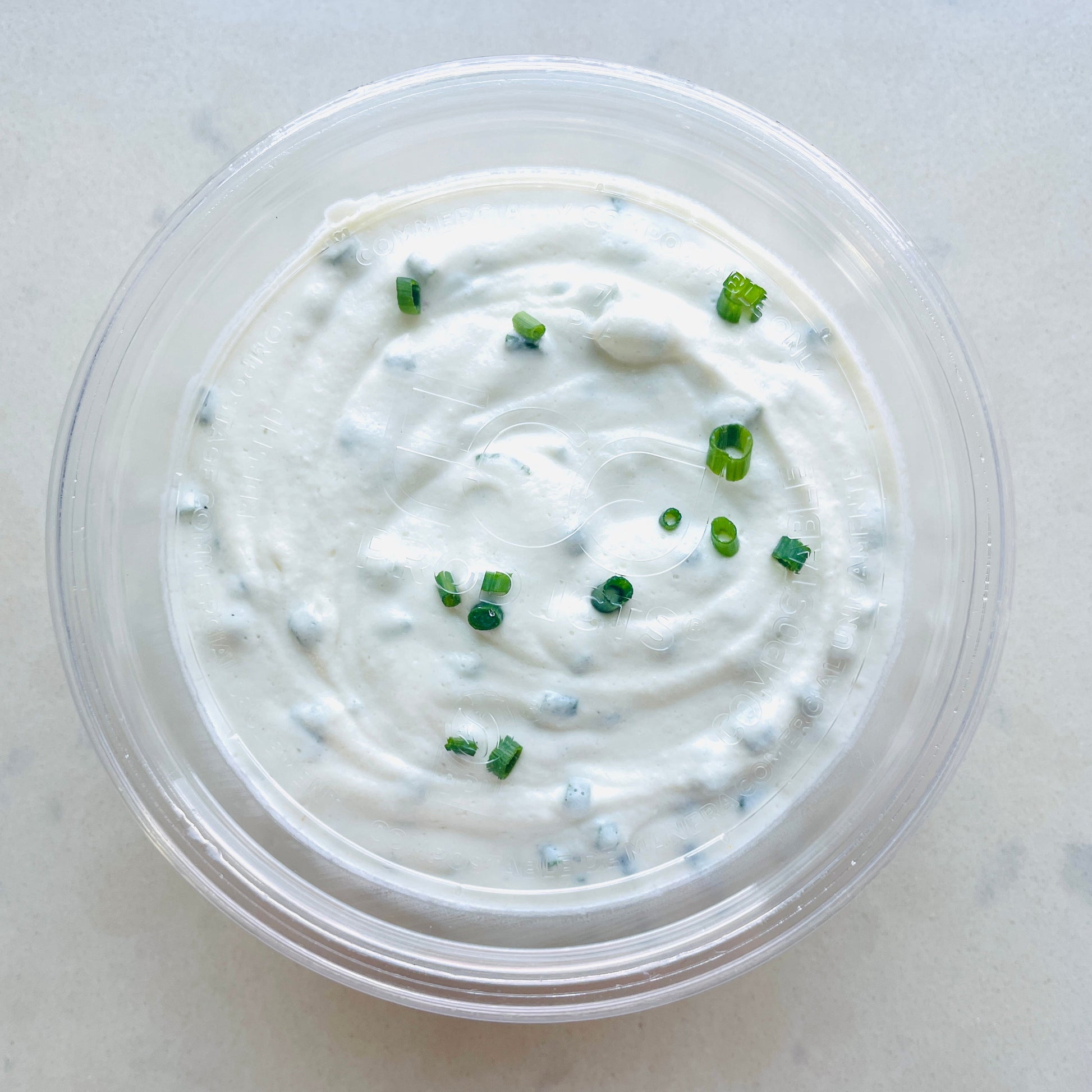 5 ounces of fluffy white spreadable 100% fresh vegan cheese made mostly from organic, non-GMO California ingredients including almonds, garlic, lemon, chives, extra-virgin olive oil (all organic), and sea salt.
